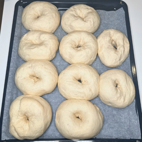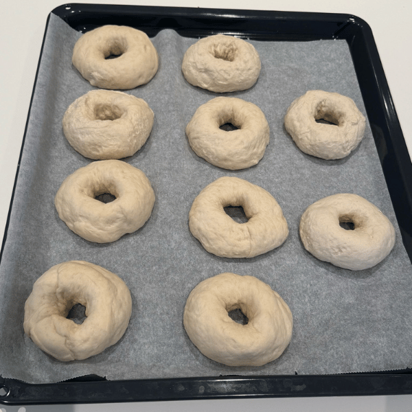 Legg bagelsene på bakepapirkledd brett og dekk til.