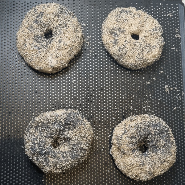 Mens bagelsene fortsatt er fuktige, dypp dem i sesamfrø eller valmuefrø.