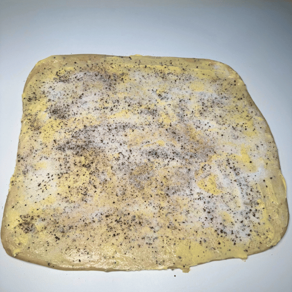 Når deigen er ferdig hevet, dryss litt mel på benken og kjevle deigen ut til et stort rektangel, ca. 3–5 mm tykt.