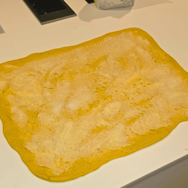 Når deigen er ferdig hevet, hvelves den ut på et lett melet bord. Kjevle den til et stort rektangel, ca. 0,5–1 cm tykkelse. Smør et jevnt lag mykt smør utover hele flaten og strø sukker jevnt over. Brett deigen over hverandre og kjevle den sammen igjen for å få den samlet.
