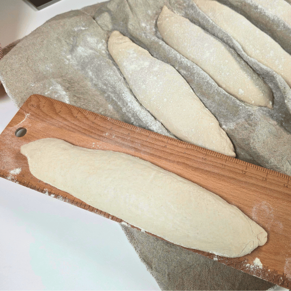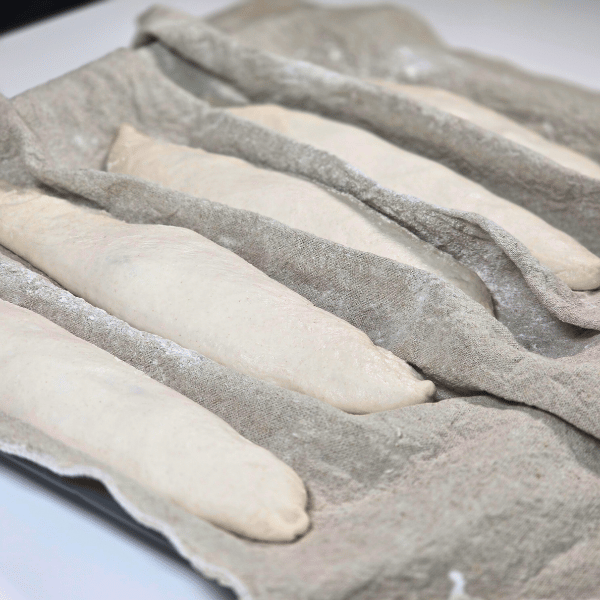 Legg heveklede på et brett og strø lett med mel. Form baguettene avlange og legg dem i kledet. Lag små “vegger” av klede mellom hver baguett for å hindre at de klistrer seg sammen.